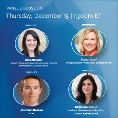 Susan Lund, VP of Economics and Private Sector Development, IFC; John Van Reenen, LSE & MIT; Daniela Scur, Cornell University; Raffaella Sadun, Professor of Business Administration in the Strategy Unit, Harvard Business School.